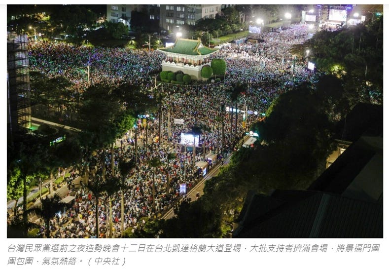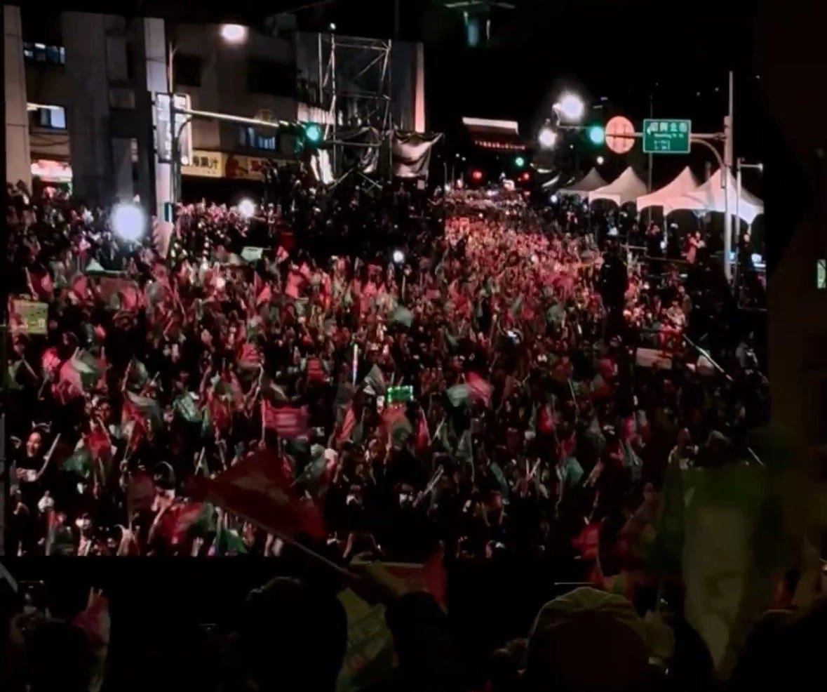 我们没参加民进党的动员大会,看网上的报道说,昨天的动员会人气不如柯文哲。但是这会儿开票进行了一半,民进党的总统票优势已经相当明显,说现场一片欢腾气象也不为过。