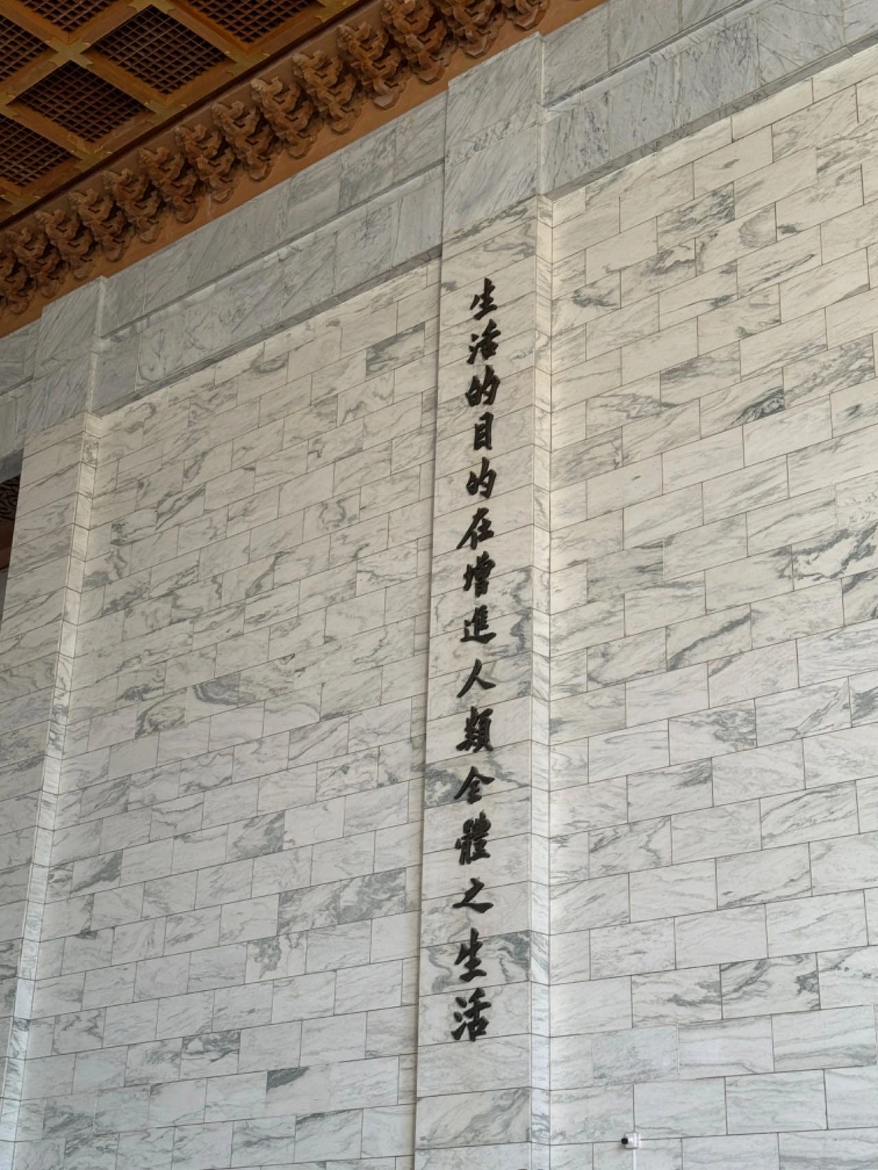 中正纪念堂是一个挺漂亮的建筑物,端庄又不失秀雅。主厅里蒋中正的塑像、题字,遗嘱印刻仍在,比如这句:“生活的目的在增进人类全体之生活。”